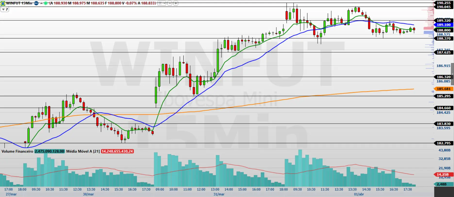 Na última sessão, em 1º de abril, o mini-índice WINJ26 registrou uma leve queda de 0,12%, finalizando o dia negociado a 188.800 pontos. Essa movimentação sucede um período de alta significativa, sinalizando uma provável redução do ímpeto comprador no curto prazo e indicando que o mercado busca reajustar suas posições.