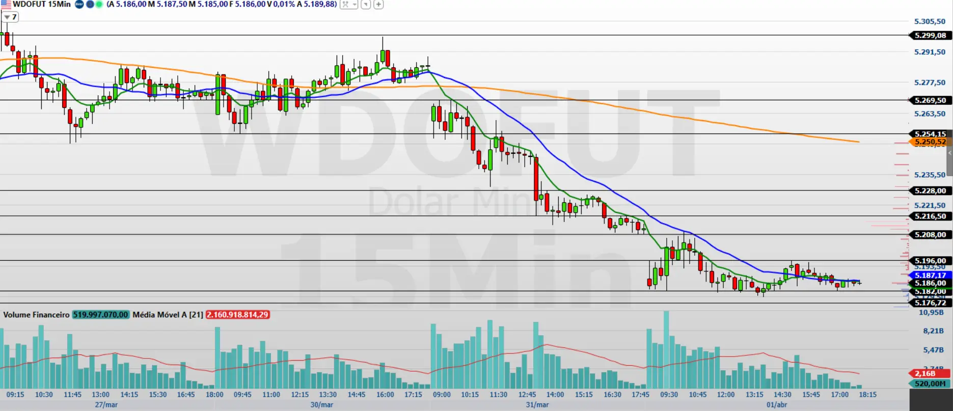 O Minidólar (WDOJ26) registrou uma notável pressão vendedora, evidenciada pela queda de 0,48% em seus contratos com vencimento em maio na última sessão, em 1º de abril. O ativo encerrou o pregão em 5.186 pontos, solidificando um viés de baixa que prevalece no curto prazo. Este movimento reflete o retorno do dólar a patamares pré-guerra, impulsionado por um cenário externo de alívio e a expectativa crescente de um acordo entre Estados Unidos e Irã, o que impactou a cotação da moeda.